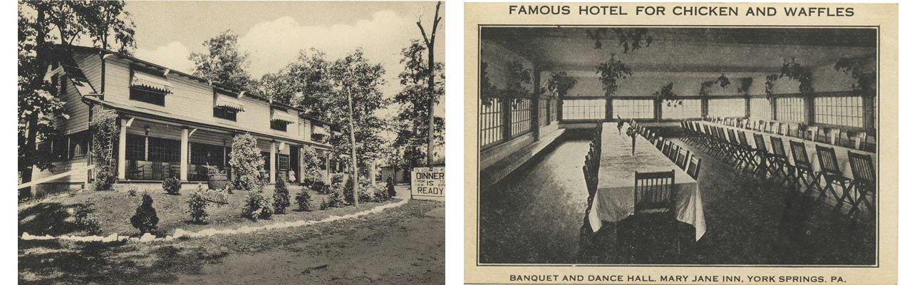 As noted in the Gettysburg “Compiler” of April 7, 1923, W.R. Wengert (also seen as Wingert) planned to erect a building at his grove of trees along the Gettysburg and Harrisburg Road for a tea room. The Mary Jane Tea Room, named for his wife, opened up that summer and by the following summer, Wengert had added a dance pavilion and lodging house. For the first few years, the business was only open in the spring and summer, but by the late 1920’s, the Mary Jane Inn was serving chicken and waffles daily from 11 am to 8 pm.